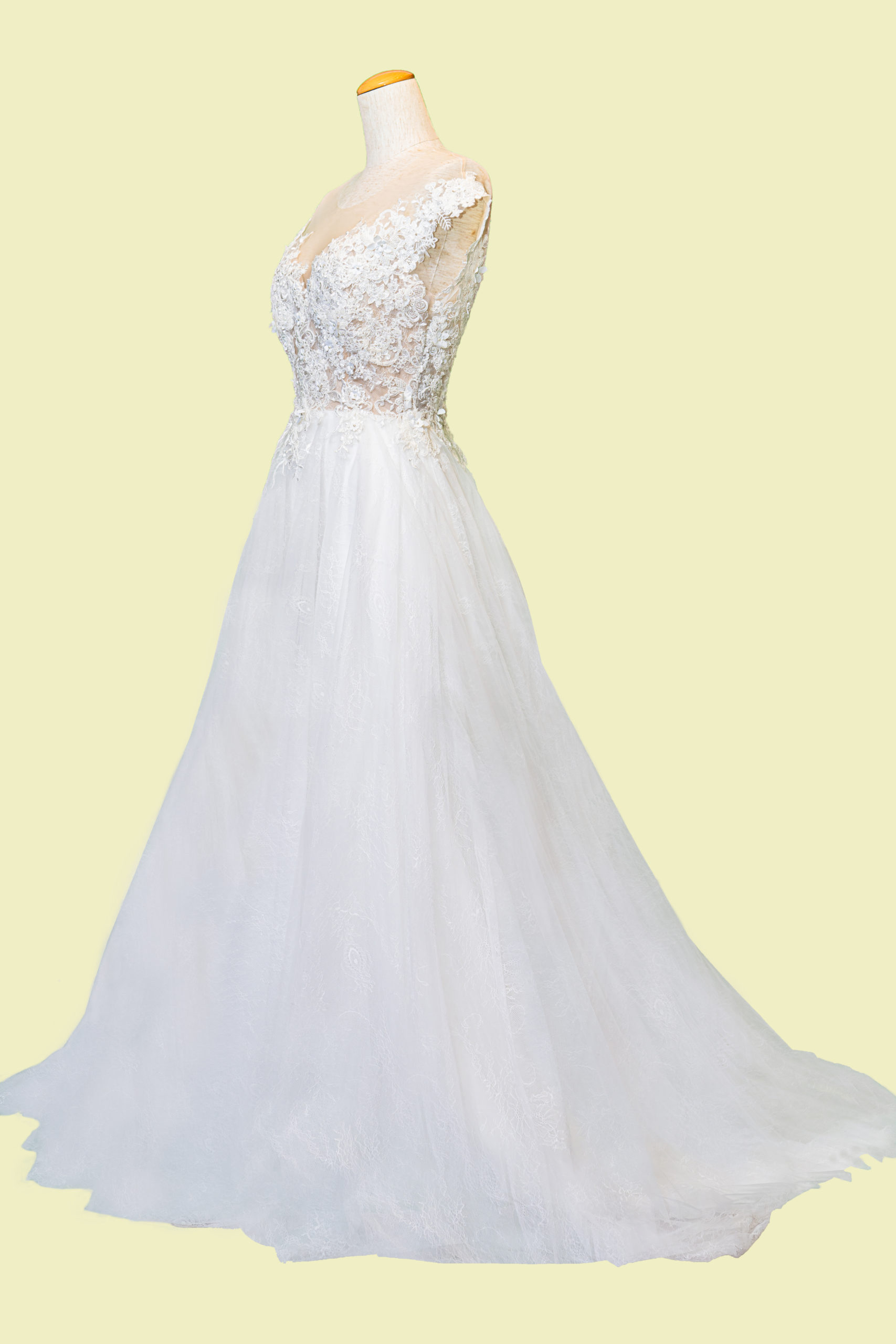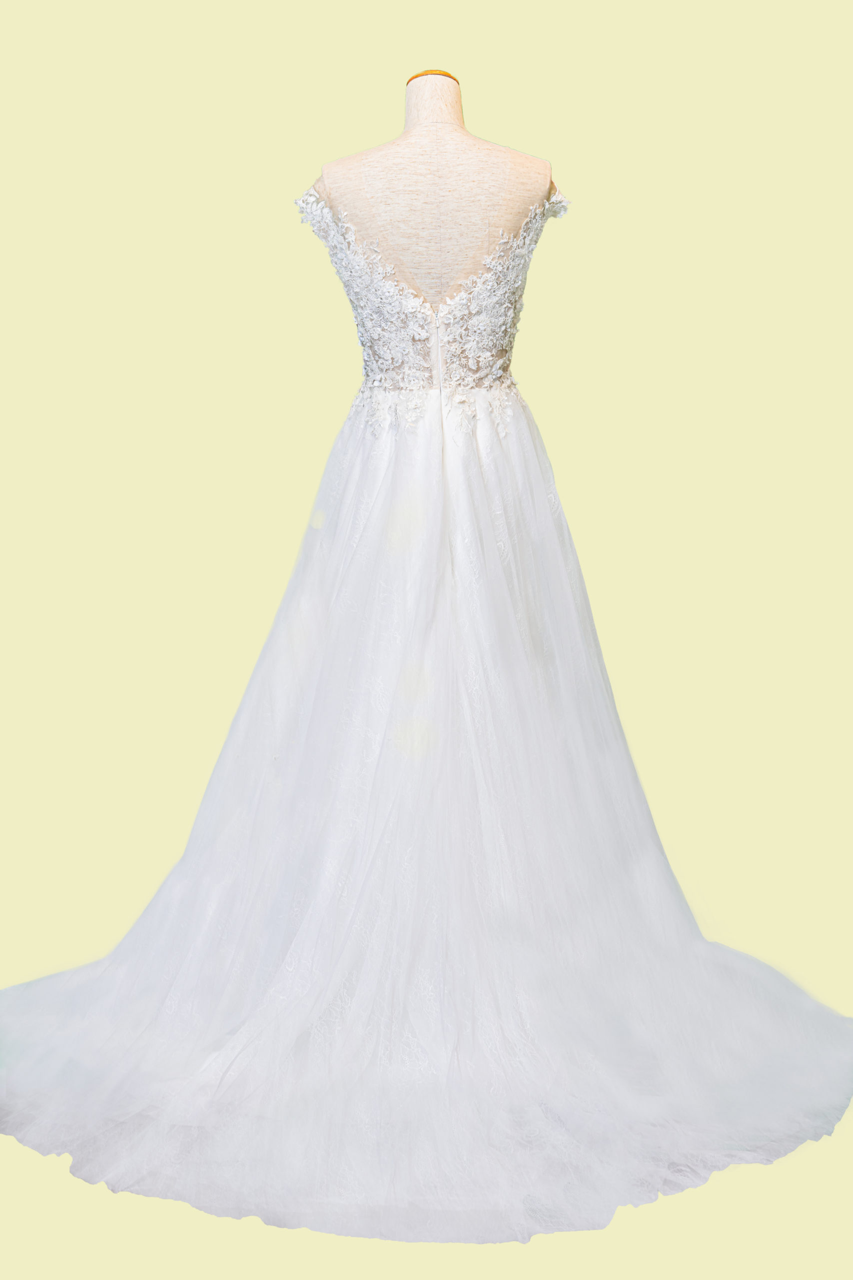 上半身の繊細なレースとチュールスカートが可愛らしいオフショルダー風のカジュアルドレスです。ドレスの重量も軽くロケなどにもおすすめです。