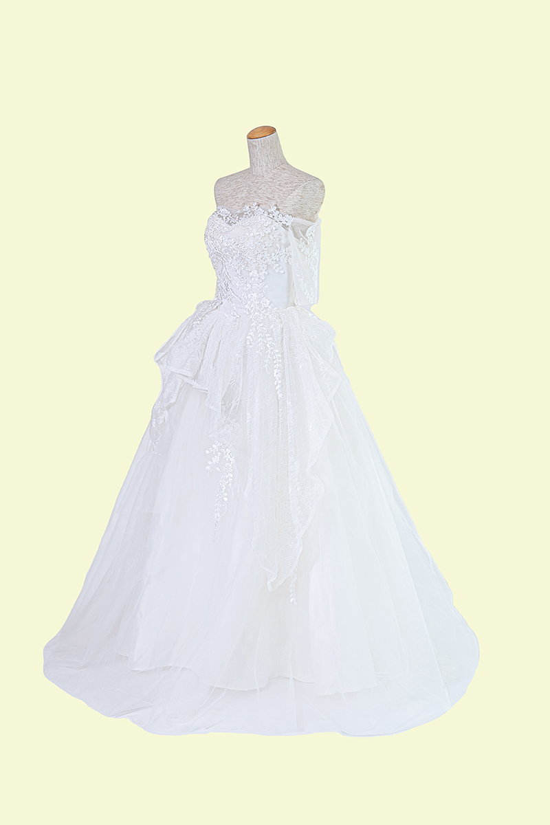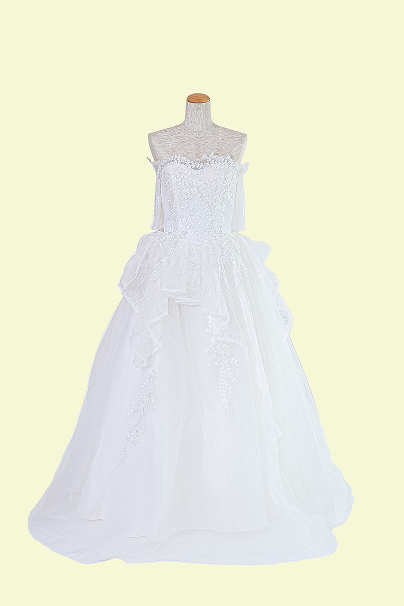デコルテラインの緩やかなハートカットやウエスト部分から流れるフリルで愛らしく、ツヤ感のある刺繍でキレイめのウェディングドレスです。7分袖は腕を布で覆われている面積が多いため、露出が気になる人にも安心です。また、カジュアル感を出してくれるのでロケーションフォトにぴったりです。