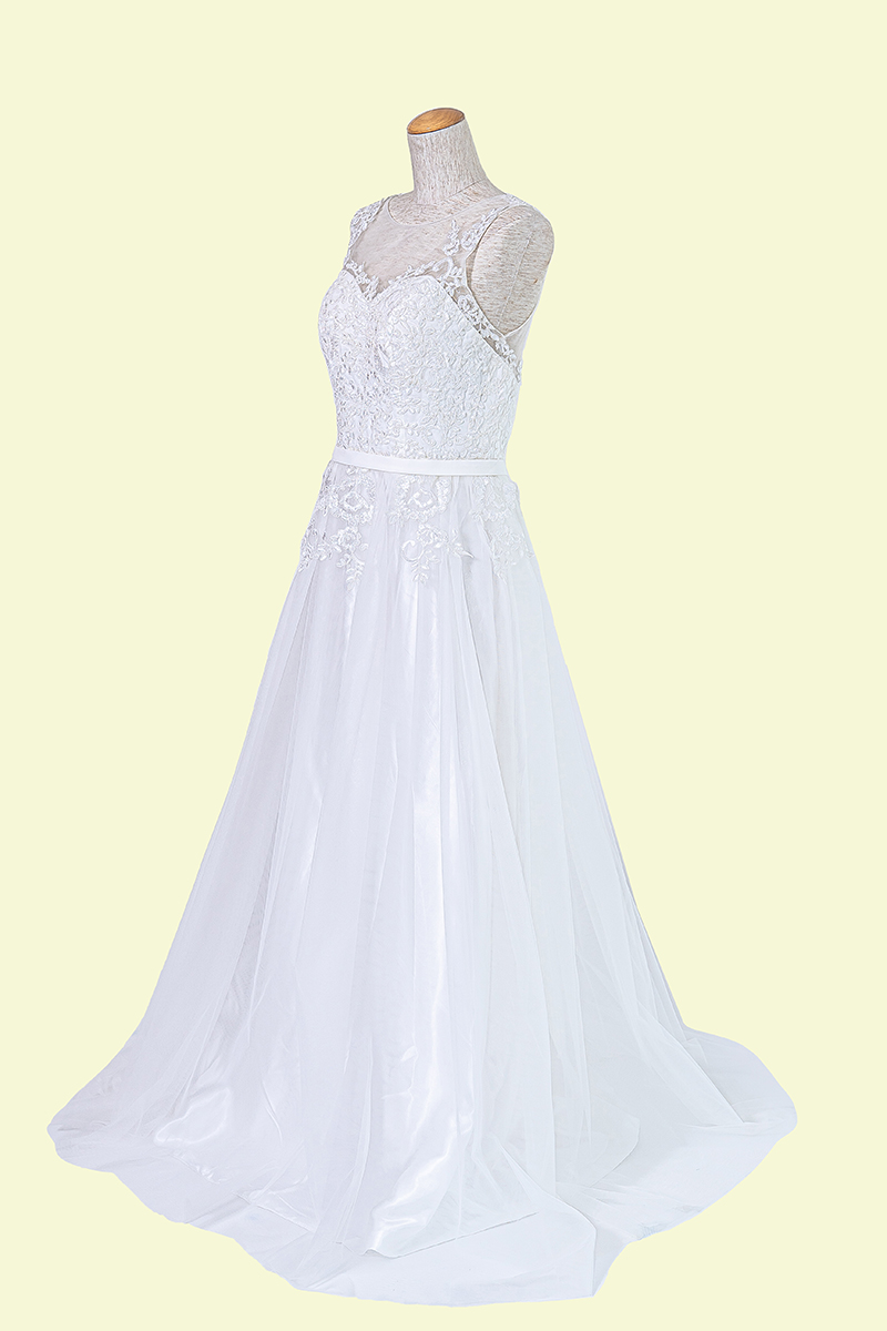 肩部分、バックスタイルがシースルーになっており豪華な印象なカジュアルドレス。ドレスの重量も軽くロケなどにもおすすめです。