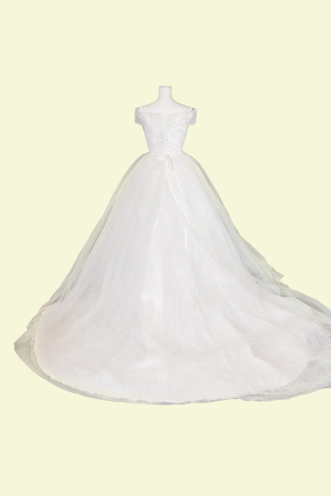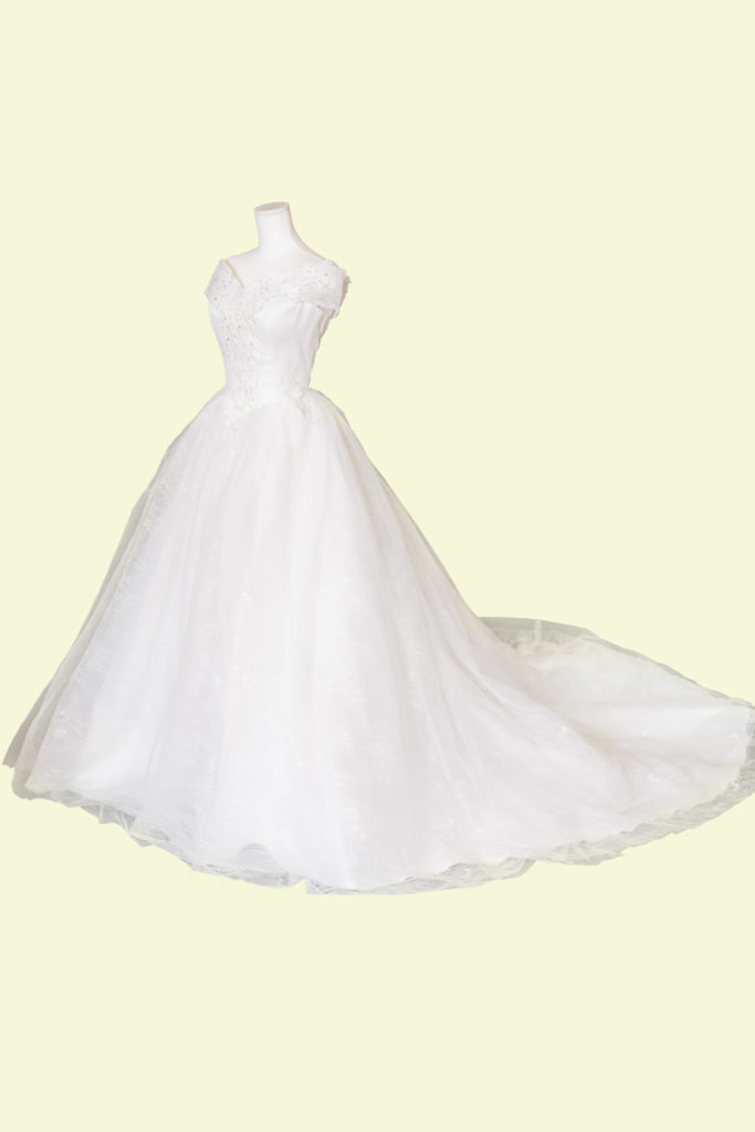 純白な色味でバスト部分のVカットがエレガントさを演出したっぷりのボリュームで可愛らしさもあります。