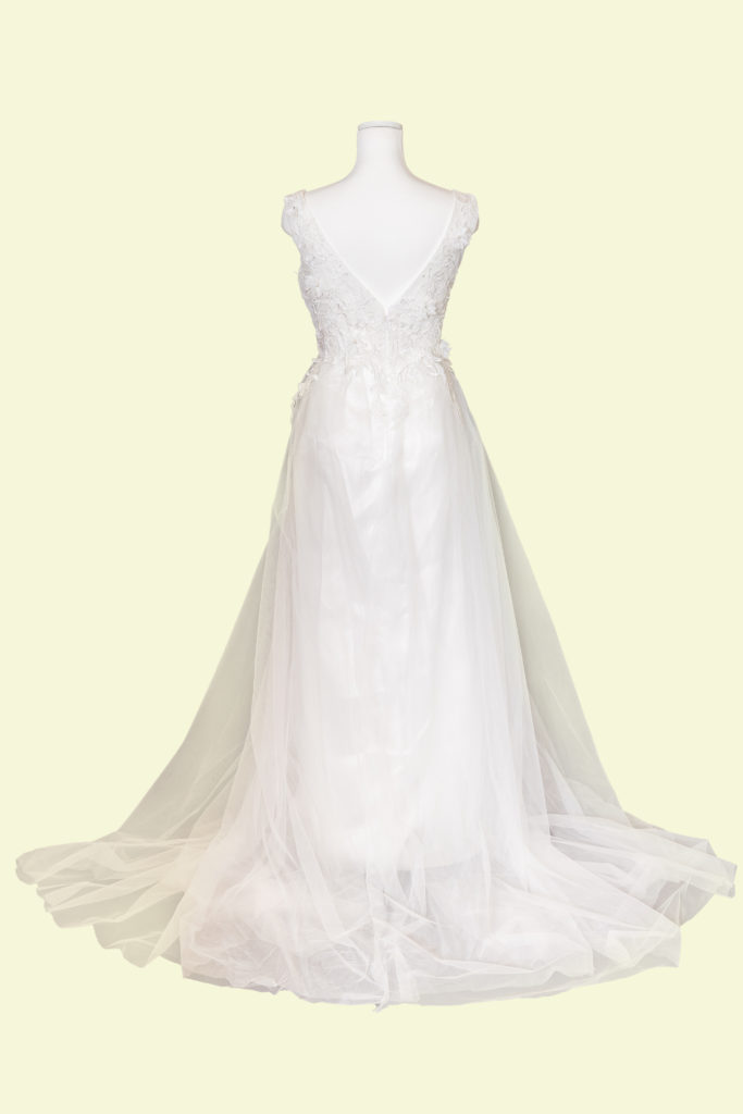 純白な色味で胸元がVカットになっていますのでデコルテ部分も綺麗に見えます。ウエストのラインもスッキリと綺麗に見えます。