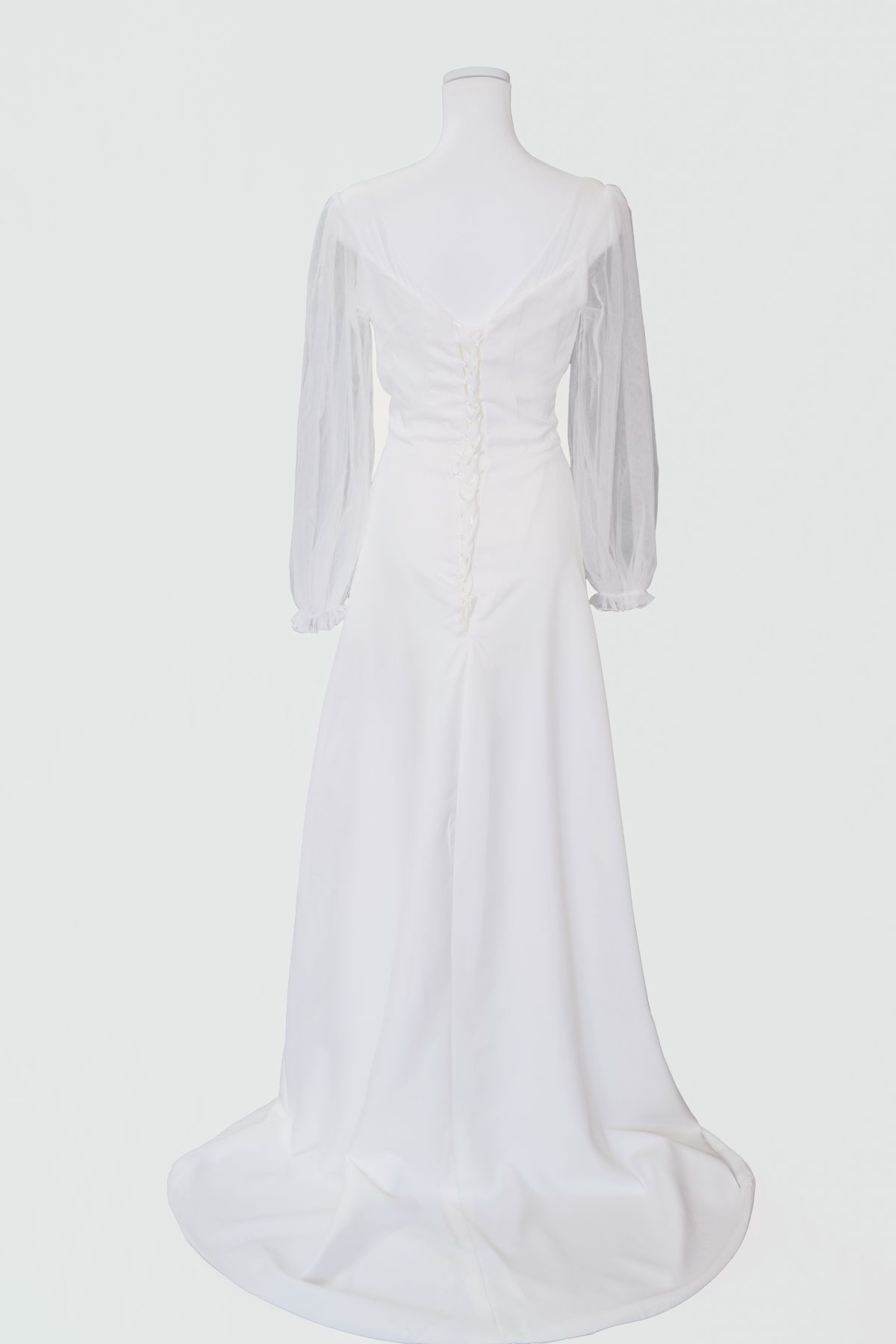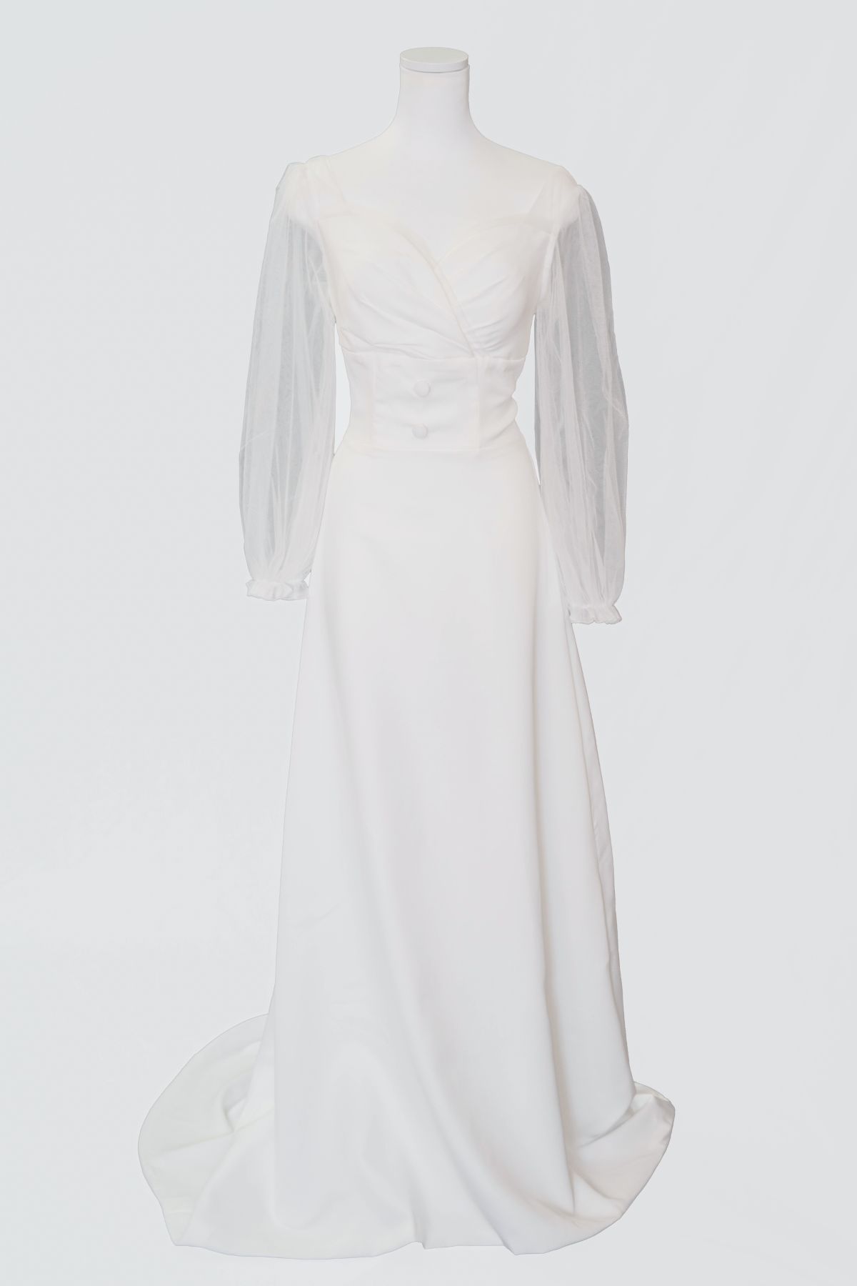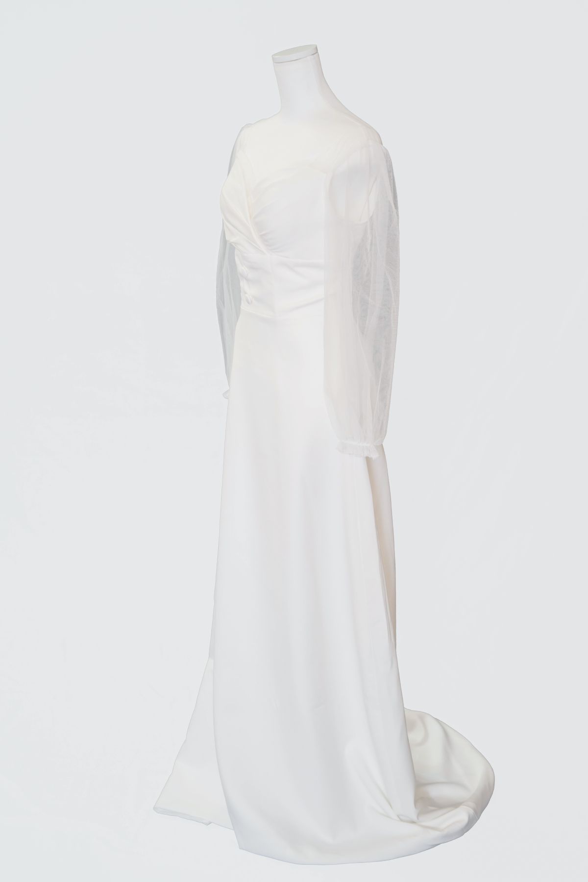 バスト部分は緩やかなカーブのハートカップ。手首までの生地はレースになっており抜け感もありシンプルデザインながらエレガントな印象も与える本格ドレス。