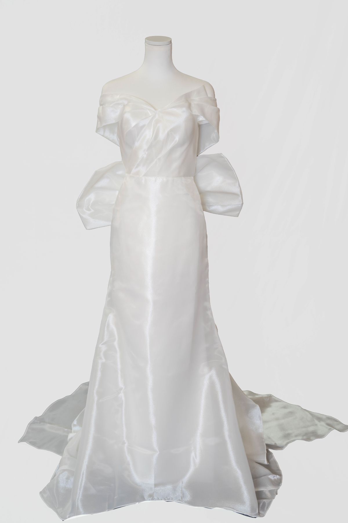 光沢のある生地が使用されマーメイドのような華やかなデザインのドレスです。バック部分には大きなリボンが装着可能となっております。