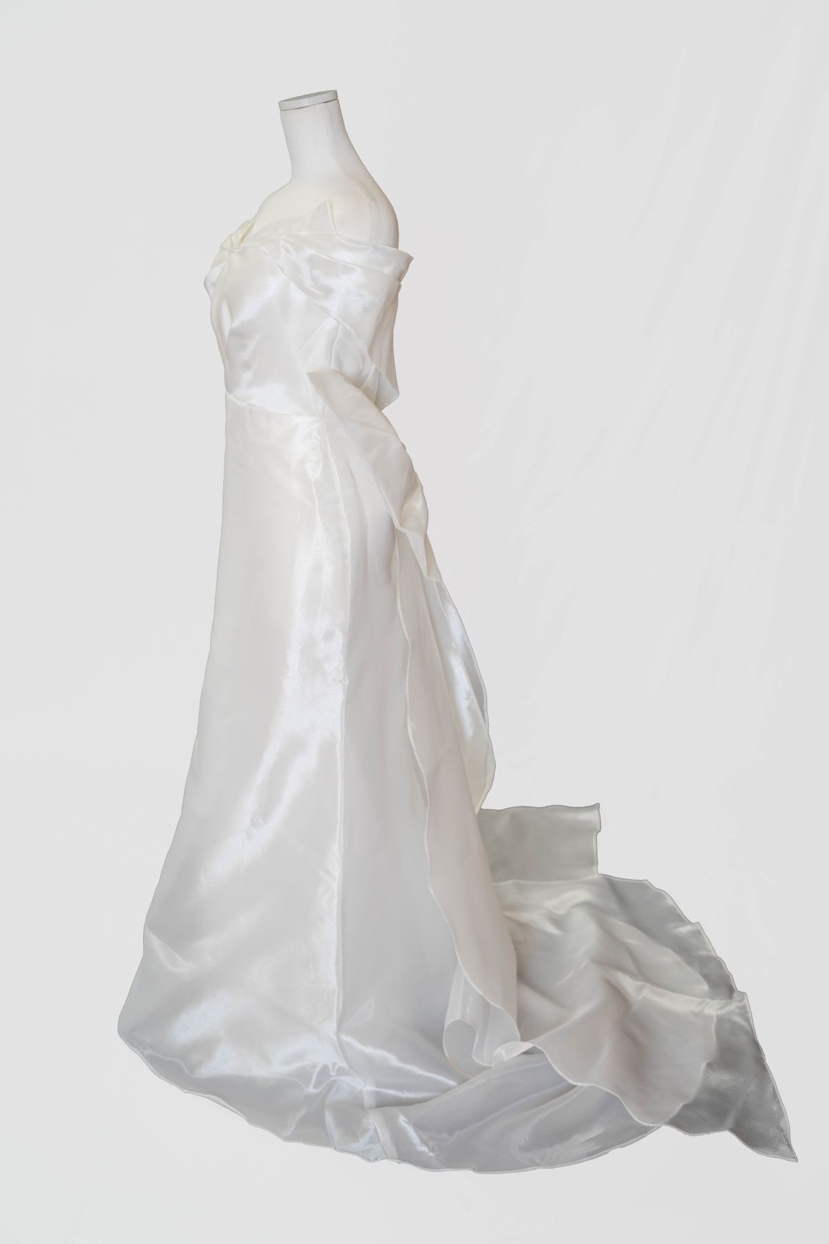 艶感のある生地でバックリボンが取り外し可能な本格ドレス