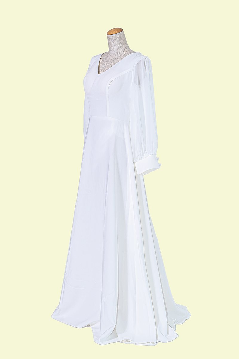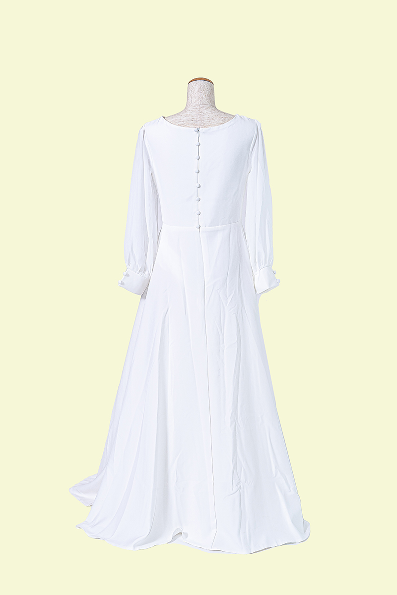 シースルーの長袖が華やかな印象なシンプルカジュアルドレス。ドレスの重量も軽くロケなどにもおすすめです。