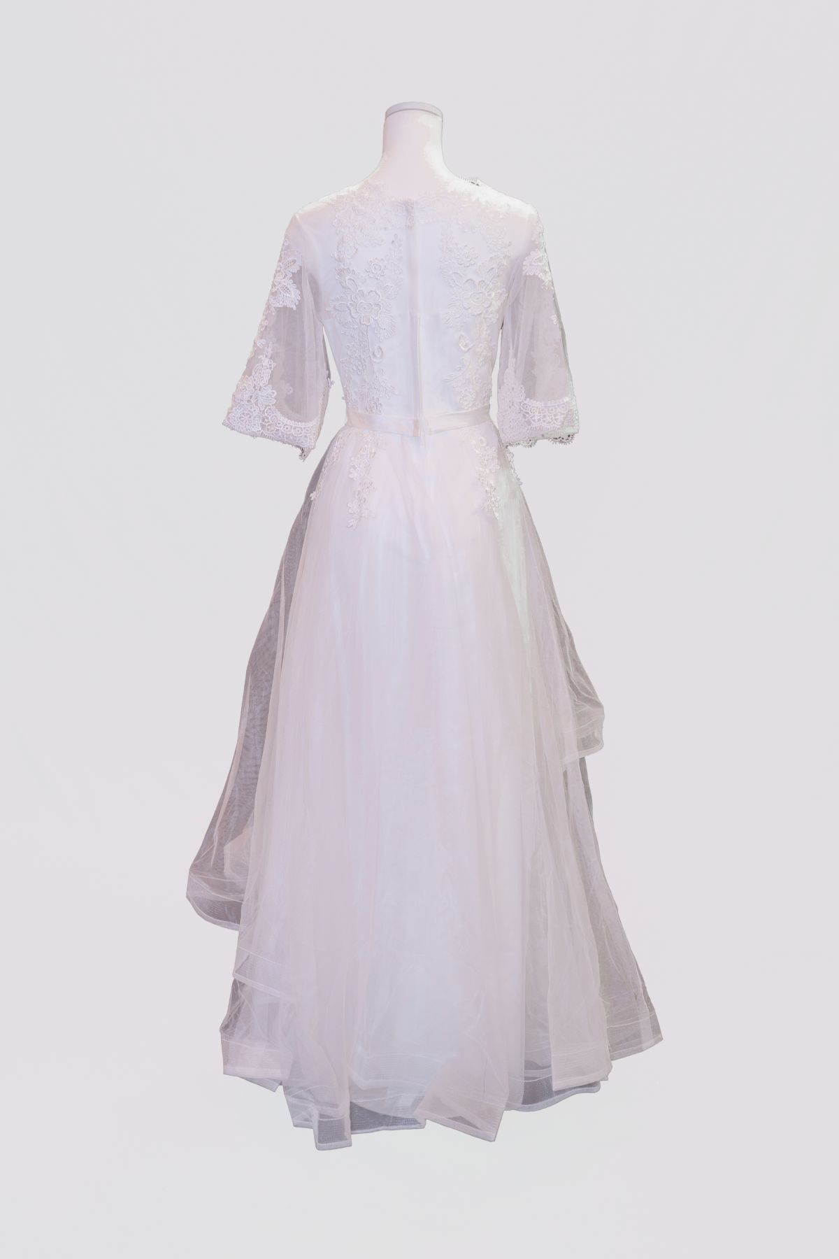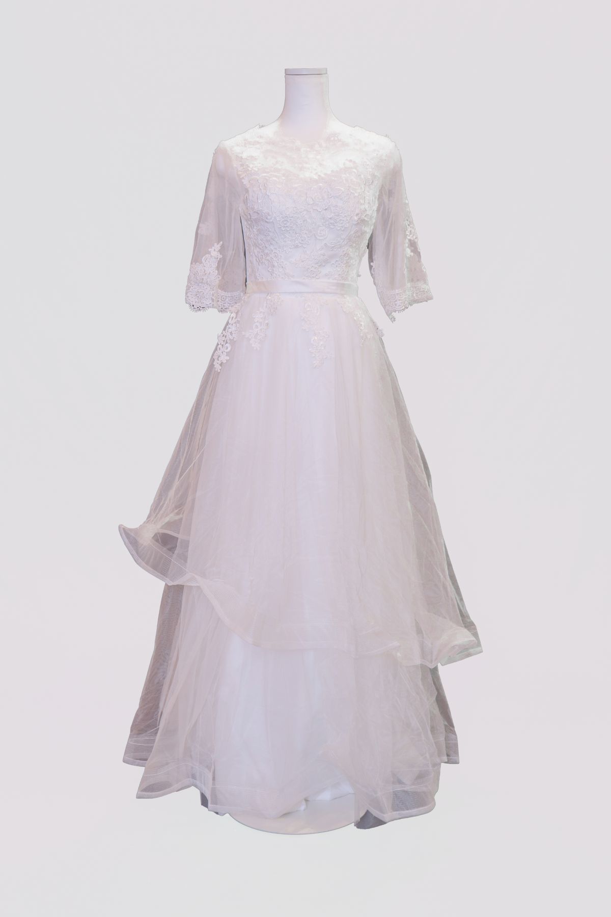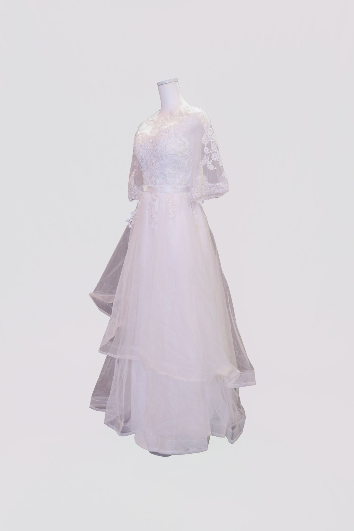 バストから袖部分、ウエストラインまで贅沢にレースが使用されスカート部分はチュール生地で優しい印象の本格ドレス。腕をカバーされたい方にお勧め。