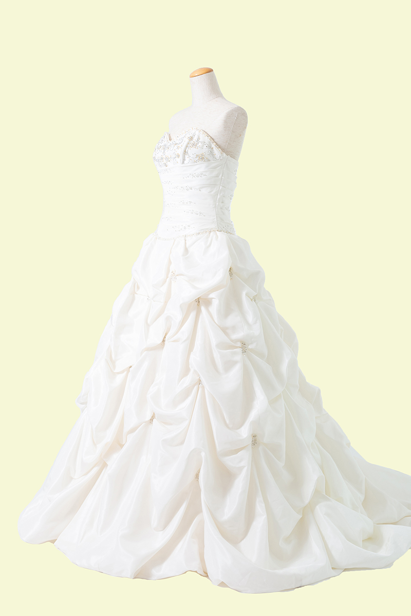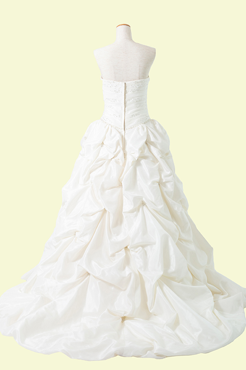 デコルテラインのハートカットですっきりとした印象とタッキングスカートで立体的に見せて華やかな印象がマッチしているウェディングドレスです。ローウエストになっている為、ウエストのくびれラインを強調できスタイリッシュに見えスカートの部分がより美しく見えます。ロケーションフォトでのシルエット撮影にオススメです。