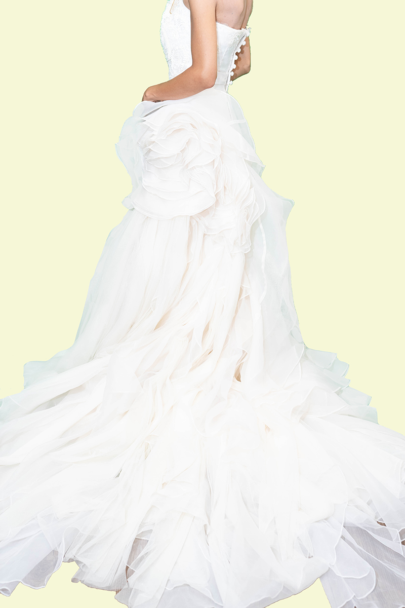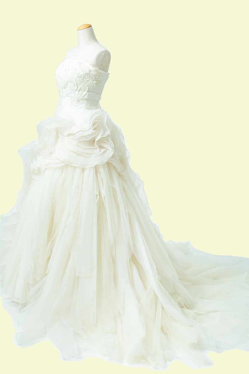 スカート部分にたくさんのチュールが施されていてゴージャスな為、ビーチフォトにオススメです。エレガントな雰囲気にしたい方にぴったりなウェディングドレスです。また、アシメントリーで抜け感があり裾を持ってのフォトウェディングも可愛らしくなります。