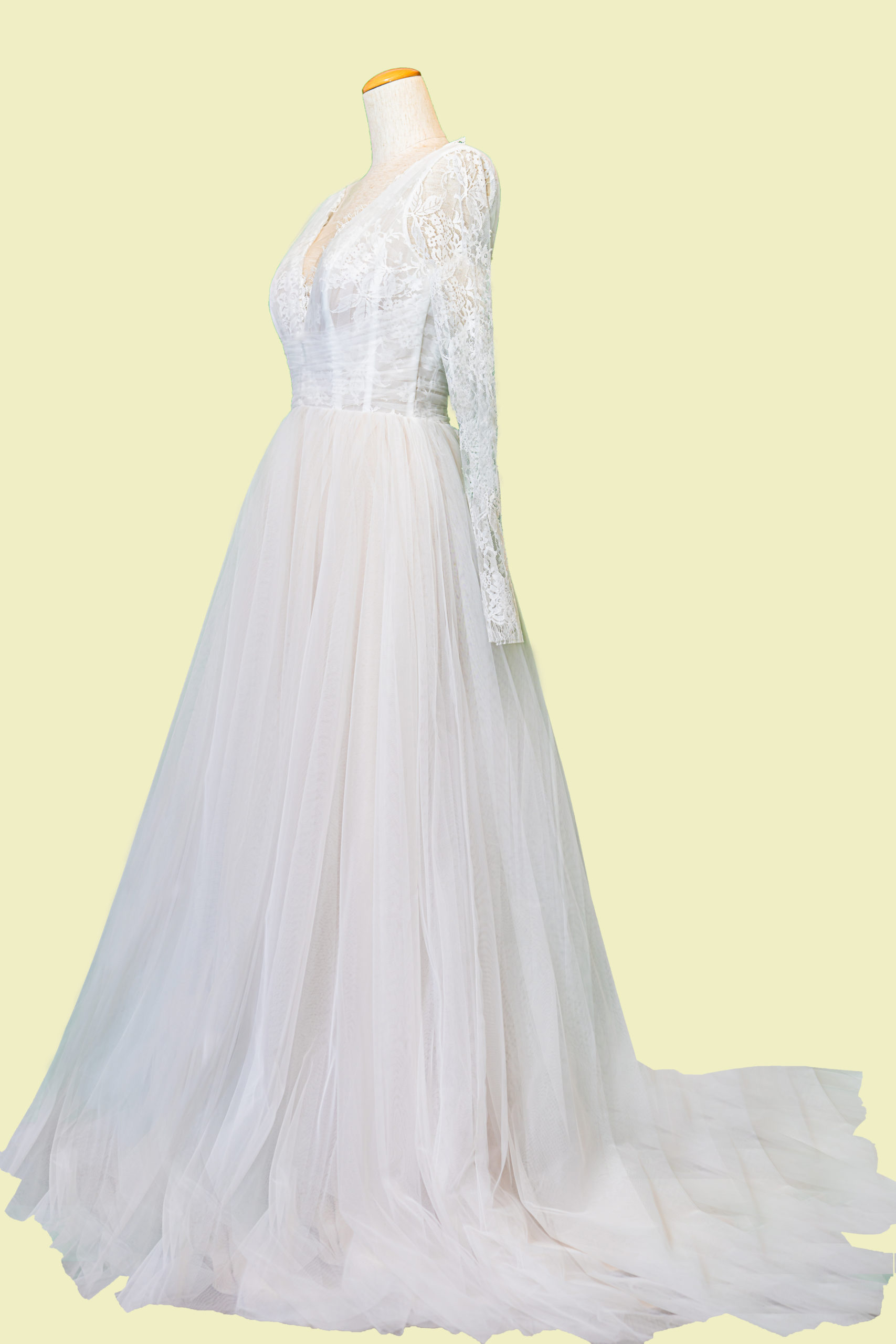 フロントとバックともにVネックに大きく開いたウェディングドレスは上半身がスッキリ見えます。繊細なレースで覆われたシースルーデザインの長い袖が可愛らしいデザインです。チュールのスカート部分もふわふわで可愛いです♡