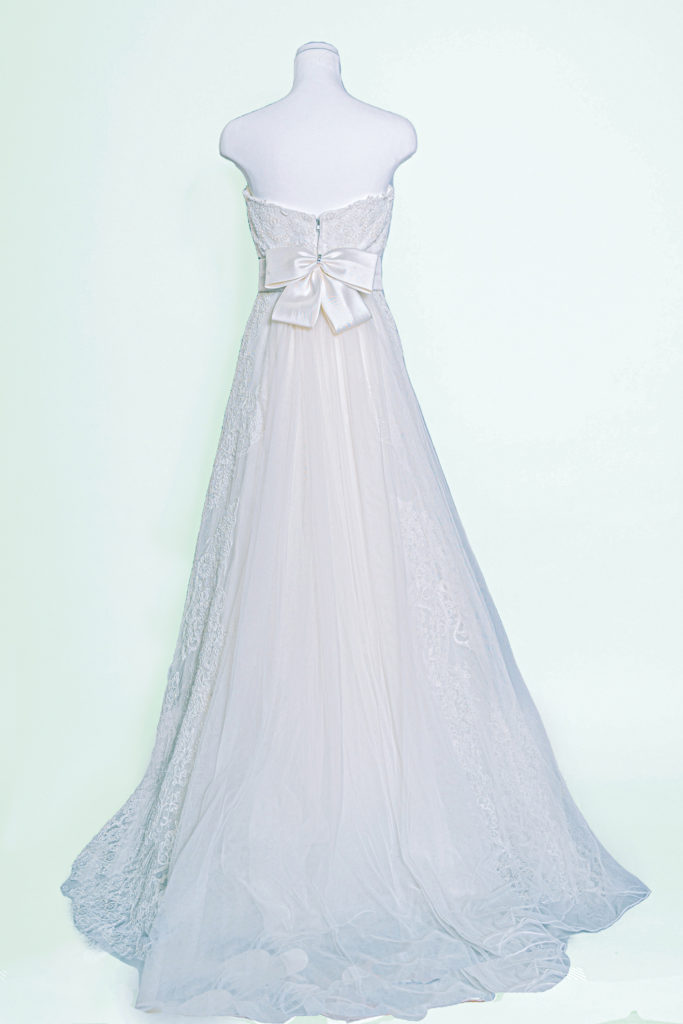 腰部分にはウエストリボンと全体がレースで仕上げられ正面とバックスタイルのイメージが変わる本格ドレス。
