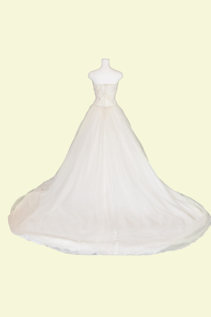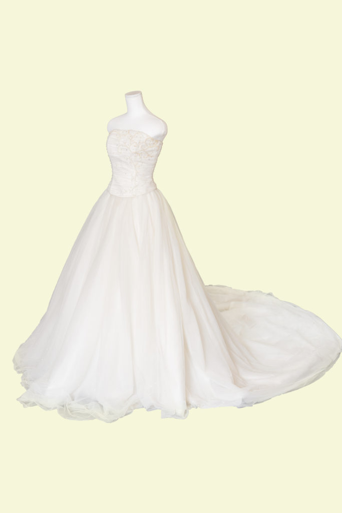 オフホワイトの色味でバスト部分は総レースでスカート部分はふんわりとした生地なので可愛らしい印象が引き立ちます。